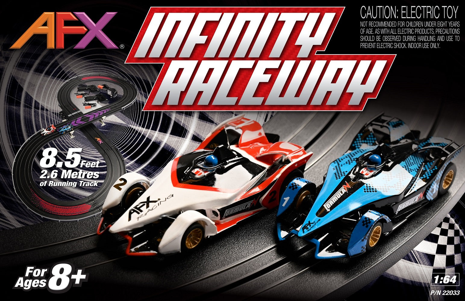 The AFX Infinity Raceway set is a jaw-dropping, thrilling introduction to a lifelong hobby. It assembles in minutes and packs a fun challenge into a small amount of floor space. Vibrant purple and blue race designs add color and style to the track. Tight corners and fast over-passes bring some of the most exciting aspects of HO scale slot car racing to the set.