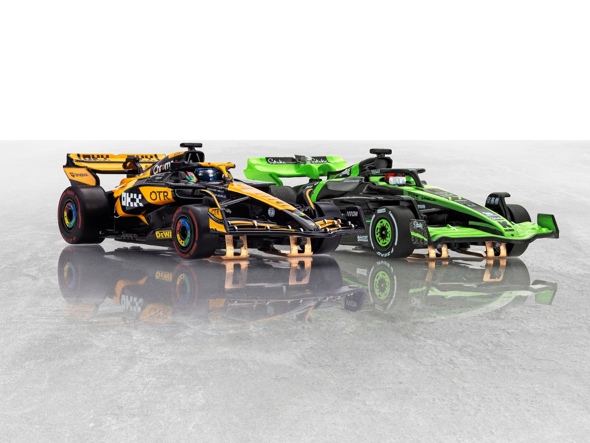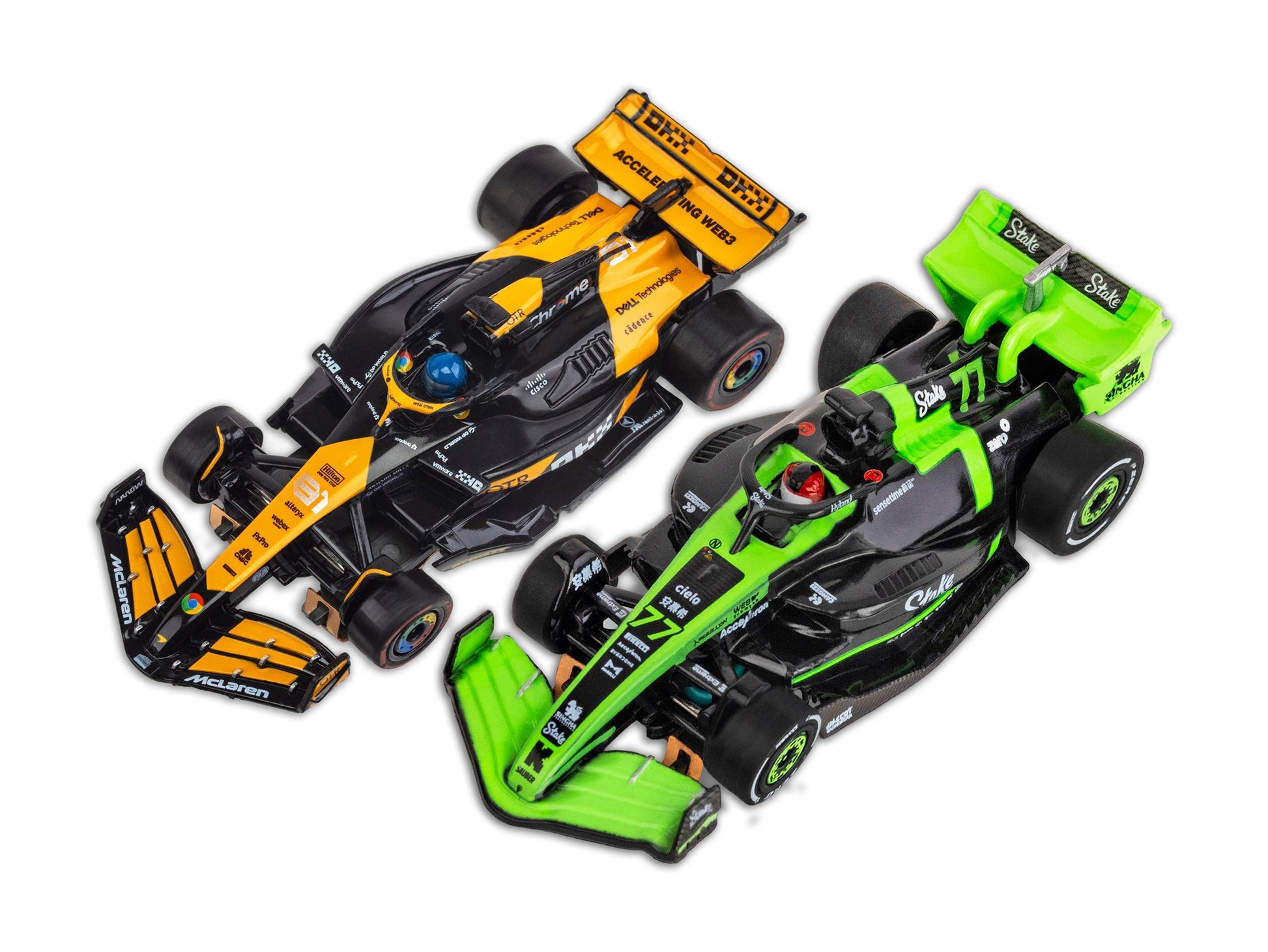 This officially licensed race set comes with finely tuned, incredibly detailed graphics on two of the most popular Formula One liveries of 2024. The McLaren F1 MCL38 driven by Oscar Piastri #81 goes up against the Sauber F1 C44 driven by Valtteri Bottas #77. Get the thrill of a real racing championship with 6 different track layouts complete with long straightaways, banked curves and speed traps.