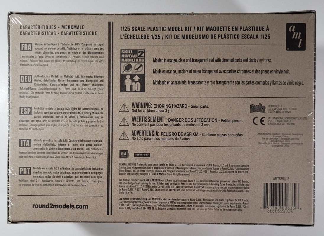 AMT635L Model Kit - 1970 1/2 Chevy Camaro Z/28. Molded in orange, clear and transparent red with chromed parts and black vinyl tires.
