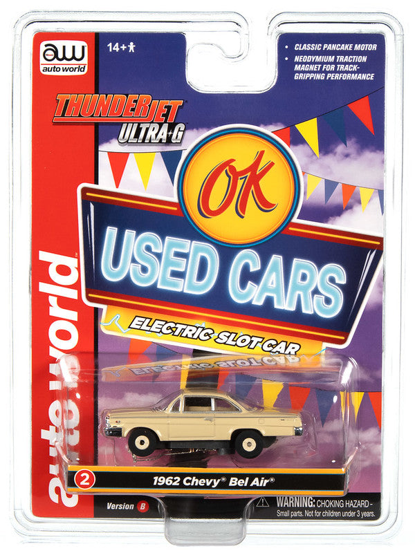 Auto World Thunderjet SC390-2B 2023 R1 OK USED CARS 1962 CHEVROLET BEL AIR COUPE (TAN) HO Scale Slot Car