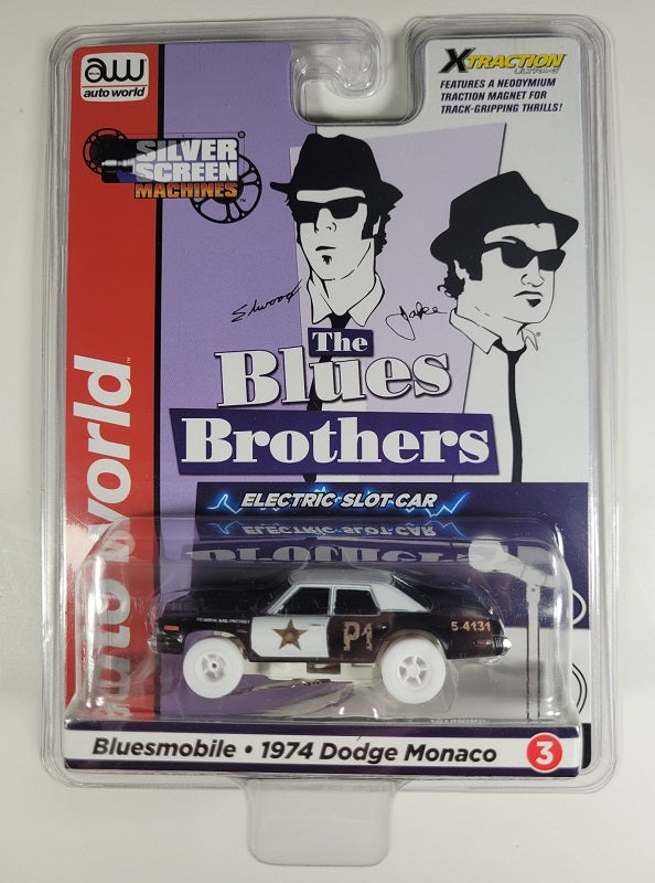 AUTO WORLD XTRACTION R36 BLUES BROTHERS - BLUES MOBILE 1974 DODGE MONACO iWheels HO SCALE SLOT CAR